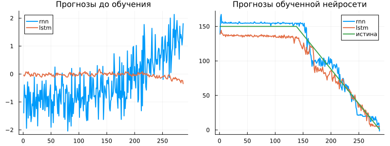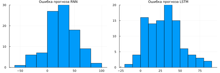 神经网络在测试数据上的表现略差,但正是这些信息使我们能够为最终确定架构和学习过程选择进一步的方向。 正如预期的那样,当切换到测试数据时,两个神经网络的预测质量都会下降(LSTM为2.1倍,RNN为2.7倍)。