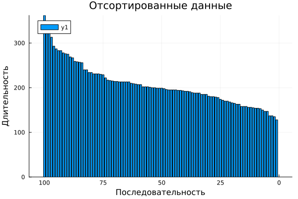 bar( sort(sequenceLength), xlabel="序列", ylabel="持续时间", title="已排序的数据", xflip=true)