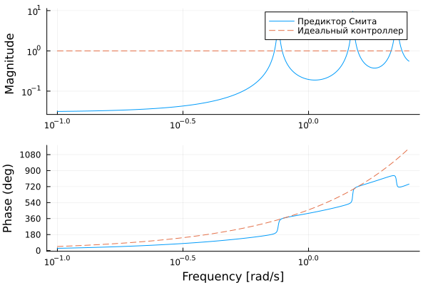 让我们构造预测器的对数幅度-相位频率响应,并将其与负延迟的频率响应进行比较。 这将是一个理想的控制器(作为一项规则,这样的控制器不能在实践中实现)。