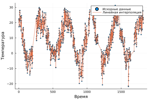 plot!(A, label="线性插值", xlabel="时间", ylabel="温度") # 温度与时间依赖性的输出