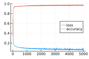 plot( [ loss_history, accuracy_history], size=(300,200), label=["loss" "accuracy"], leg=:right )