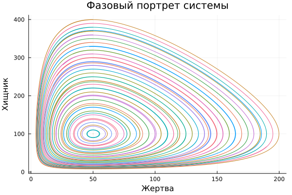 plot!(plt, sol[1, :], sol[2, :], title="系统的相位画像", xlabel="受害者", ylabel="捕食者" ,legend=false)