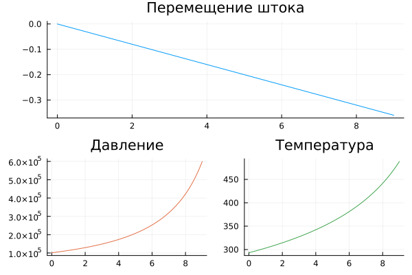 模型的主要元素是活塞块 Translational Mechanical Converter. 活塞杆的负位移意味着它被压缩并导致出口通道中的温度和压力增加。
