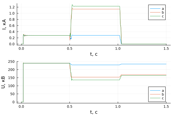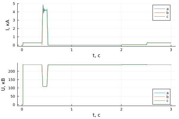 p2 = plot(sim_time, results[1, dir + 2], xlabel = "t,与", ylabel = "U,kV", label = ["a" "b" "c"])