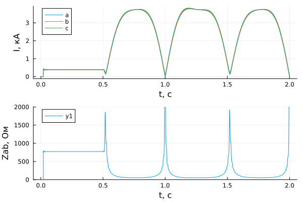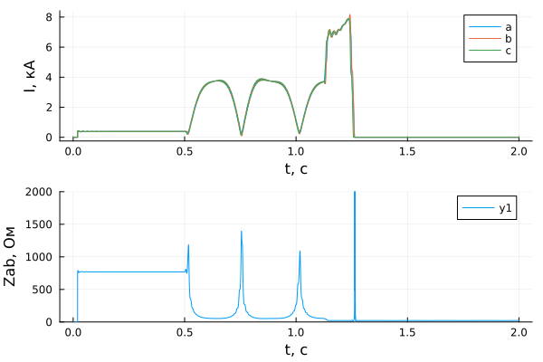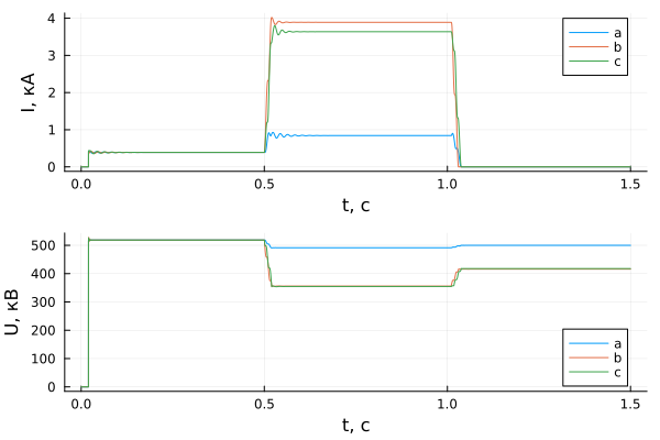 p2 = plot(sim_time, results[1, dir+2], xlabel = "t,与", ylabel = "U,kV", label = ["a" "b" "c"])