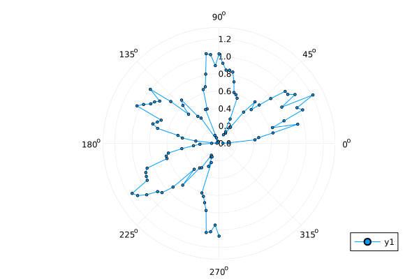 r = abs.( 0.1 * randn(100) + sin.(3Θ) )