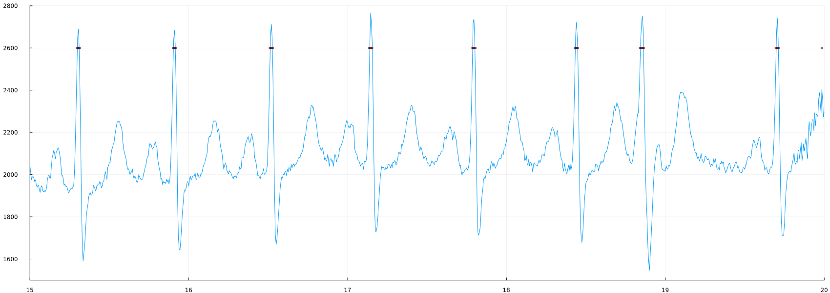 scatter!(time_1[peaks_5], ecg[peaks_5])