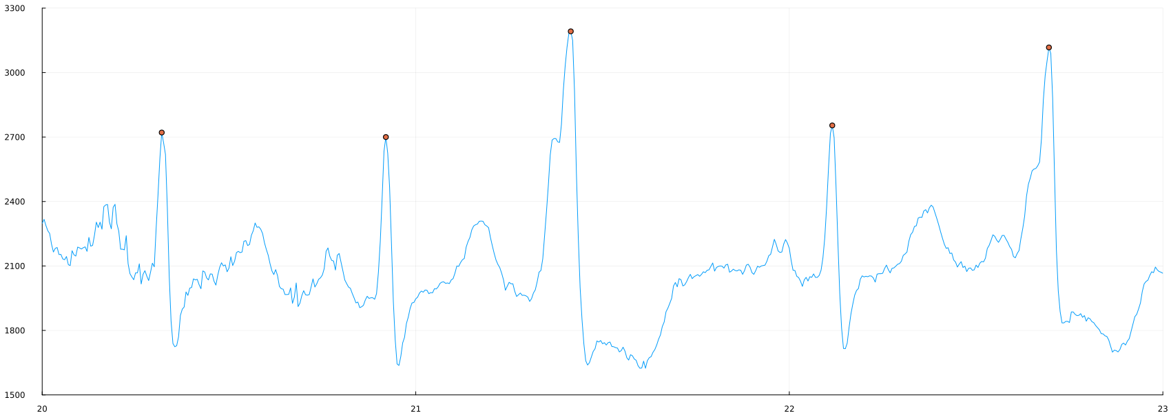 scatter!(time_1[peaks_3], ecg[peaks_3])