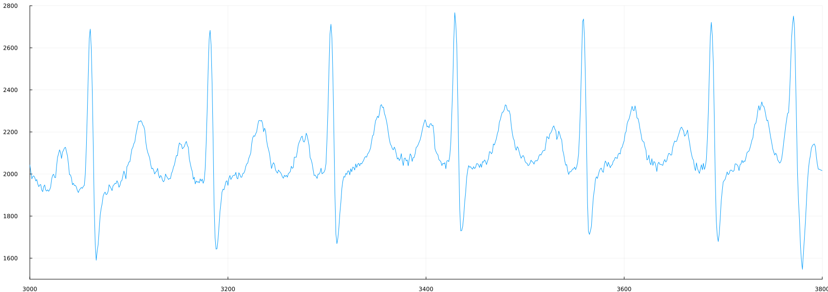 plot(ecg, label=false, ylimits=(1500,2800), xlimits=(3000, 3800))