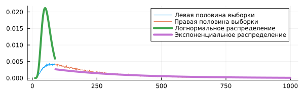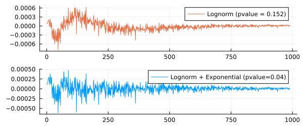 label="Lognorm + Exponential (pvalue=$(round(pvalue(OneSampleTTest(yy2 .- yy3)),digits=3)))" ),