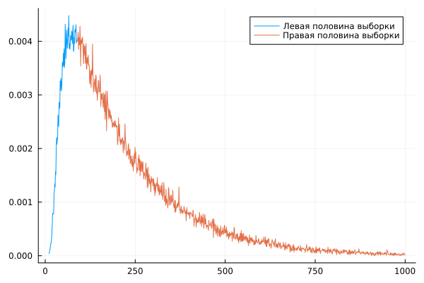 让我们试着分别研究两个样本。 为此,我们将样本分成两半(在最大值之前和之后),并找到两个分布函数的参数。 首先,分布的最大值在哪里?