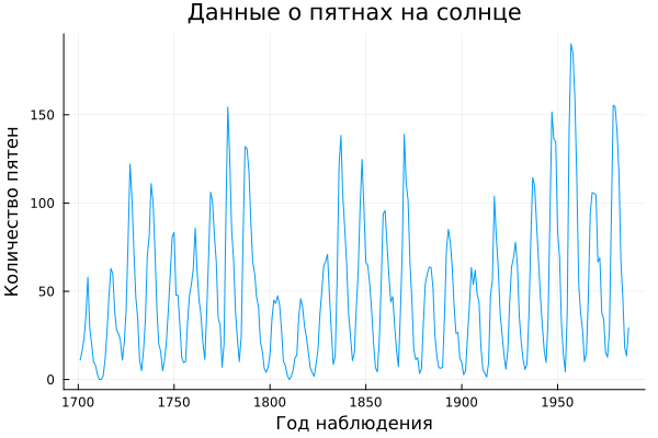 ylabel="斑点数目", title="太阳黑子数据", leg=false )