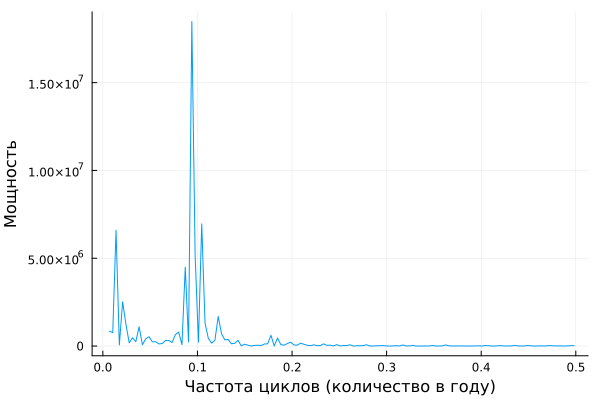 plot( freq, power, xlabel="周期频率(每年数量)", ylabel="权力", leg=false )