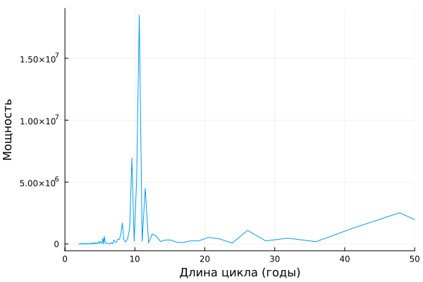 plot( period, power, xlimits=(0,50), xlabel="周期长度(年)", ylabel="权力", leg=false )