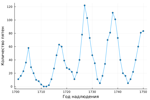 让我们近似图,并尝试更彻底地研究太阳黑子出现的周期性。 为此,我们将绘制前50年观测值的图表。