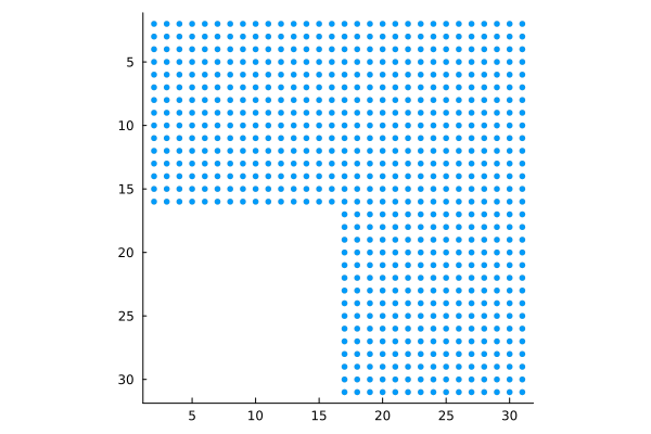 现在我们准备用Dirichlet边界条件(如果点在域内,则为1,如果在边界上,则为0)求解上述微分方程。 Julia轻松地允许您以稀疏矩阵的形式求解具有系数的线性方程组(使用[UMFPack]库(http://faculty.cse.tamu.edu/davis/suitesparse.html )-与MATLAB相同)。