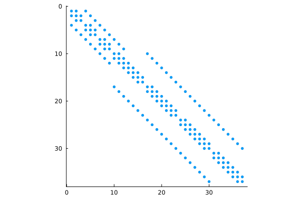 spy( D .!= 0, colorbar=false, markersize=2, markershpe=:square, markercolor=1 )