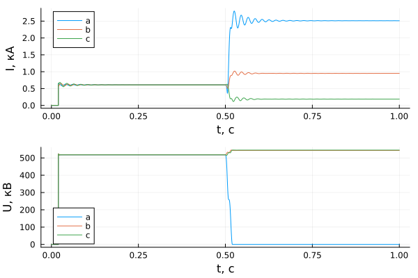 p2 = plot(sim_time, results[1, dir+2], xlabel = "t, с", ylabel = "U, кВ", label = ["a" "b" "c"])