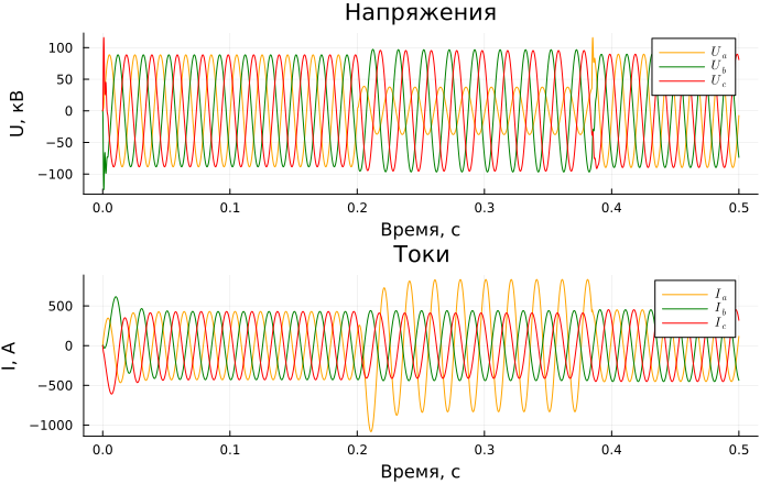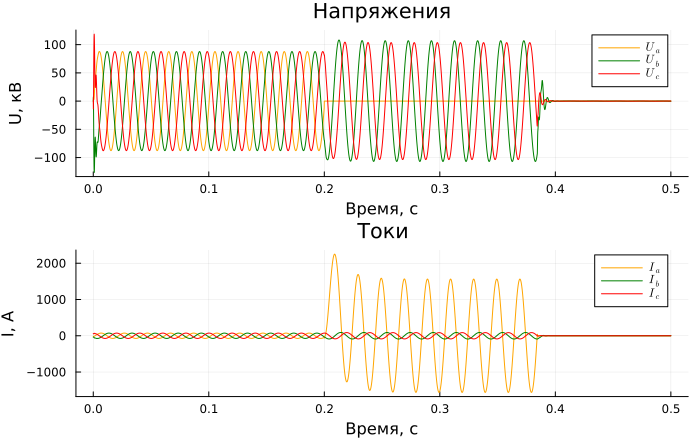 title = "电压;电压", ylabel = "U,kV", xlabel="时间,c");