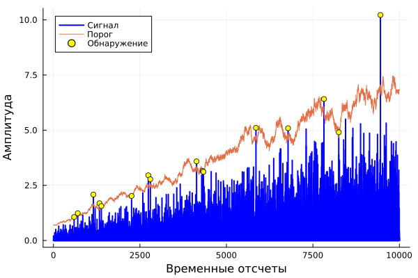 scatter!(findall(x_detected[:] .> 0),xRamp[findall(x_detected[:] .> 0)],label="Обнаружение",marker=(:circle,4,:yellow))