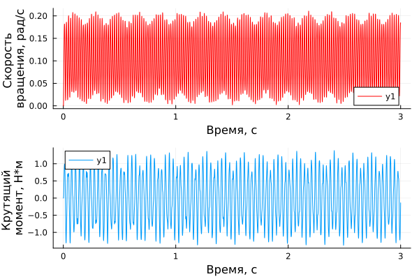 Now let's check how the different frequencies of the acting torque source affect the angular velocity of the first inertia block.
