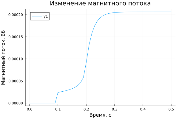 plot(MF.time, MF.value, xlabel="Время, с", ylabel="Магнитный поток, Вб", title="Изменение магнитного потока")