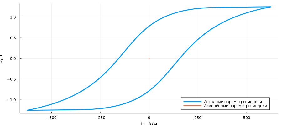 plot!(H1[100:end,2], B1[100:end,2], label = "Изменённые параметры модели", legend=:bottomright, linewidth=3)