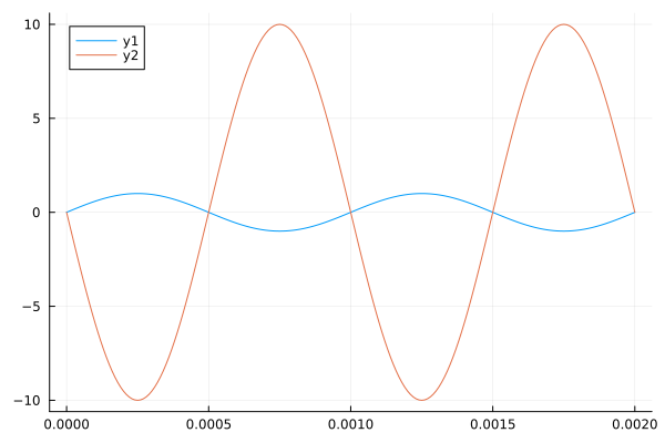 Модель состоит из блока OperationalAmplifier и двух сопротивлений R1 и R2, значения которых установлены равными 1 кОм и 10 кОм. Его коэффициент усиления равен -R2/R1, поэтому входное напряжение с амплитудой 0.1 В усиливается на выходе до 1 В. Поскольку мы используем идеальную модель, нагрузка на выходе усилителя не влияет на его работу.