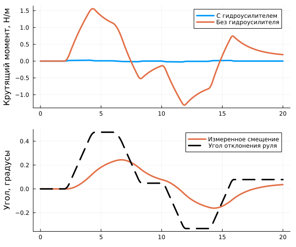 На графиках также сравнивается усилие на руле при включенном и выключенном гидроусилителе. Когда гидроусилитель выключен, водителю требуется прилагать значительно больше усилий без гидроусилителя чтобы соблюдать заданный угол поворота рейки руля.