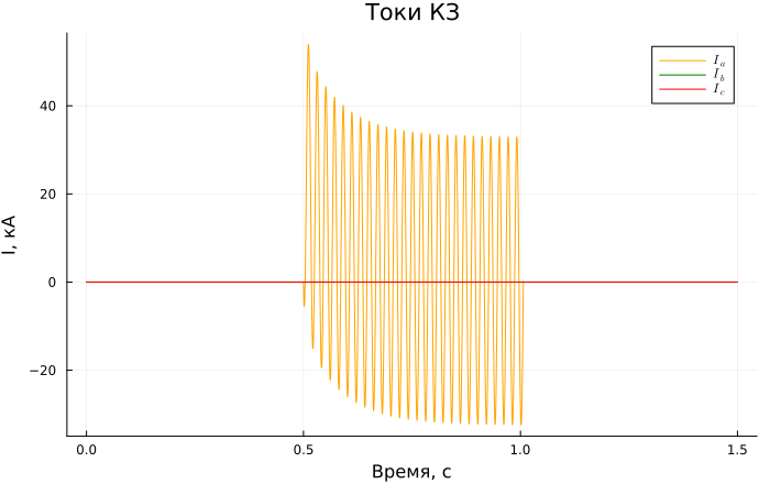 title = "Токи КЗ", ylabel = "I, кА", xlabel="Время, c", size = (700,440))