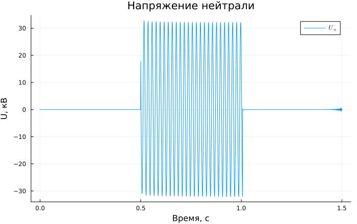 plot(sim_time, Un./1e3, label = L"U_n", title = "Напряжение нейтрали", ylabel = "U, кВ", xlabel="Время, c", size = (700,440))
