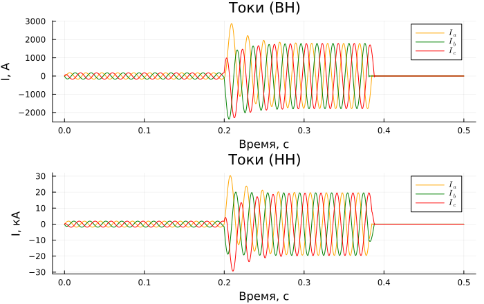 title = "Токи (НН)", ylabel = "I, кА", xlabel="Время, c")