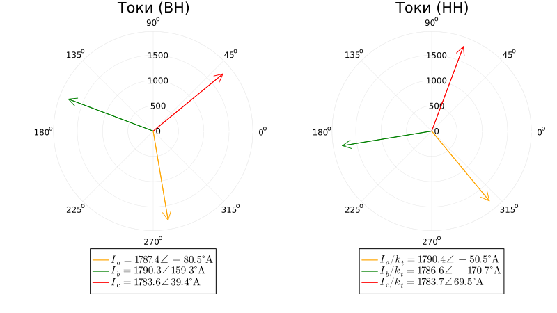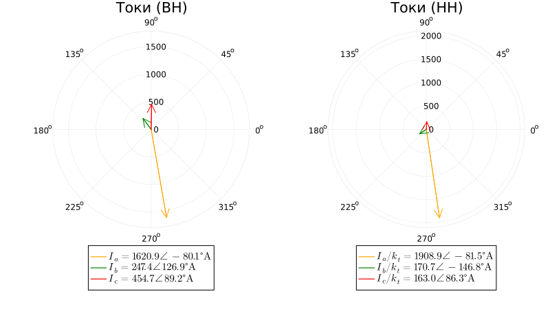 label = L"I_a = %$i_a_HV_mag \angle\, %$i_a_HV_ang \degree А", title = "Токи (ВН)")