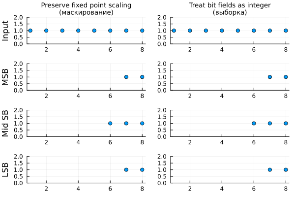 Модель extract_bits_preserve_fixed_point_scaling демонстрирует другой режим работы блока. В этом режиме последовательность выбранных битов остается на своем месте в разрядной сетке числа, остальные позиции заменяются нулями. Можно сказать, что таким образом блок реализует маскирование битов в числе.
