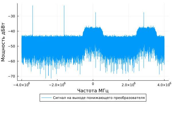 plot([-4e6:8e6/160800:4e6-1...],10log10.(abs.((spec_d/3e6))), label ="Сигнал на выходе понижающего преобразователя")