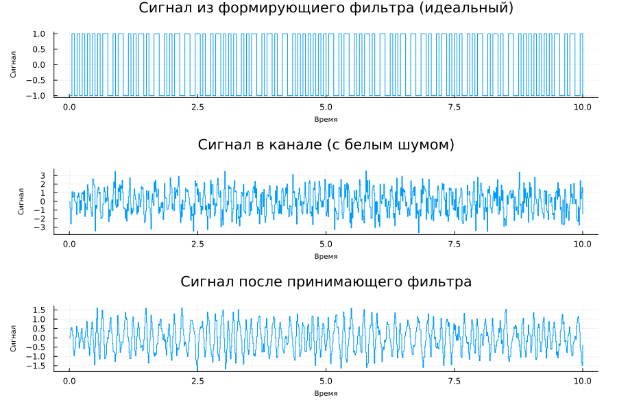 plot( Fout.time, Fout.value, st=:step, xlabel="Время", ylabel="Сигнал", title="Сигнал после принимающего фильтра", leg=false ),