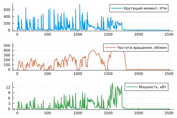 Построение графиков крутящего момента, частоты вращения и мощности электродвигателя: