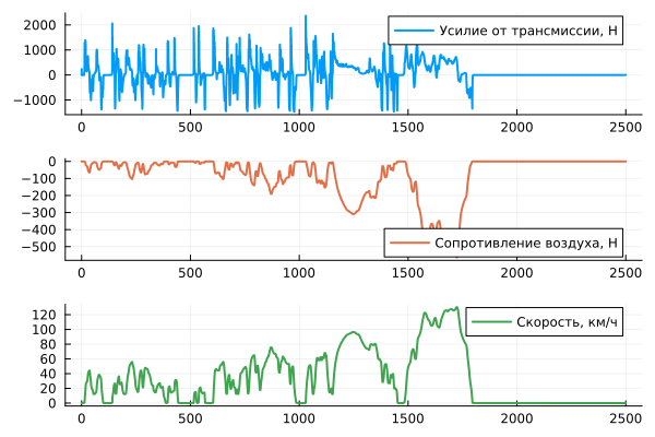 Анализ графиков сил позволяет заключить, что наибольший вклад в энергопотребление вносят этапы ездового цикла с высокой скоростью движения. Это связано с тем, что сила аэродинамического сопротивления, действующая на электромобиль, возрастает пропорционально квадрату скорости.