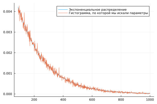 plot!( c2, w2n, label="Гистограмма, по которой мы искали параметры" )