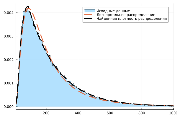 plot!( [c1; c2], [lognormDist(c1, af1.param); expDist(c2, af2.param)], lw=3, lc=:black, ls=:dash, label="Найденная плотность распределения" )