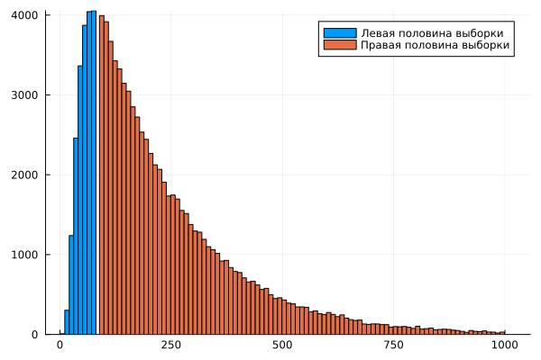 histogram!( Nc2, bins=Nc_mid+1:10:1000, label="Правая половина выборки" )