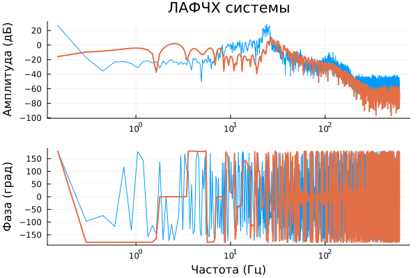 plot!( title=["ЛАФЧХ системы" ""], xlabel=["" "Частота (Гц)"] )