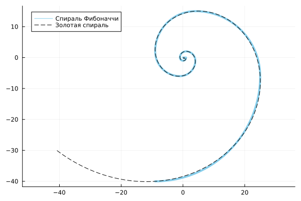 plot!( x, y, lc=:black, ls=:dash, label="Золотая спираль", legend=:topleft )