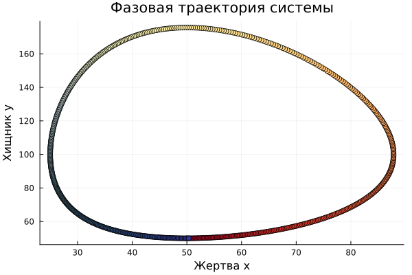 plot!(plt, sol[1, :], sol[2, :], title="Фазовый портрет системы", xlabel="Жертва", ylabel="Хищник" ,legend=false)