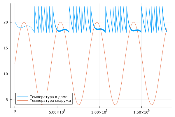 plot( res_time, [res_t_house res_t_atm], lab = ["Температура в доме" "Температура снаружи"] )