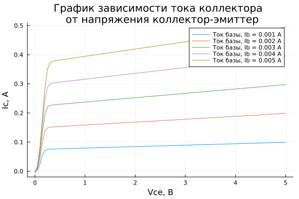 plot!(Vce[:,2], Ic5[:,2], label="Ток базы, Ib = 0.005 A")
