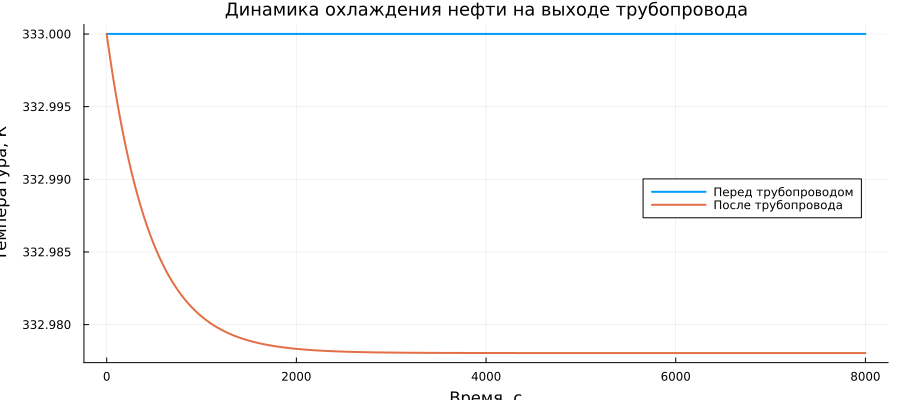 plot!( title="Динамика охлаждения нефти на выходе трубопровода", titlefont=font(12),
