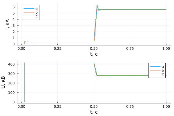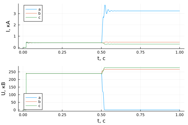 p1 = plot(sim_time, results[1, dir], xlabel = "t, с", ylabel = "I, кА", label = ["a" "b" "c"])