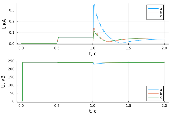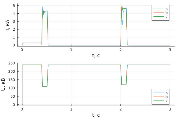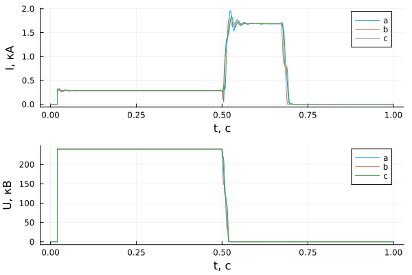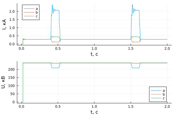 p2 = plot(sim_time, results[1, dir + 2], xlabel = "t, с", ylabel = "U, кВ", label = ["a" "b" "c"])