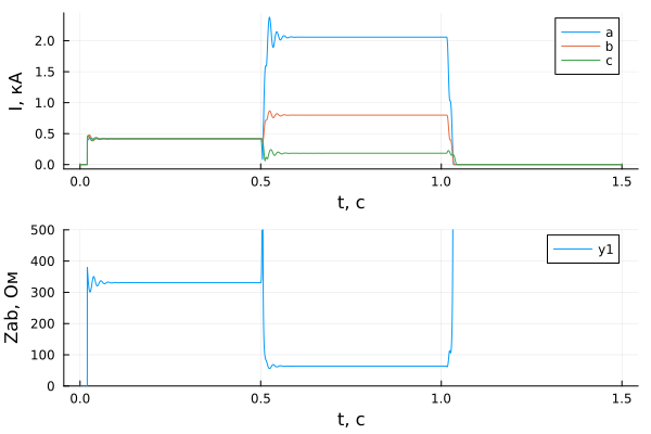 - 0,5995 с КЗ переходит на защищаемую линию (точка K2).